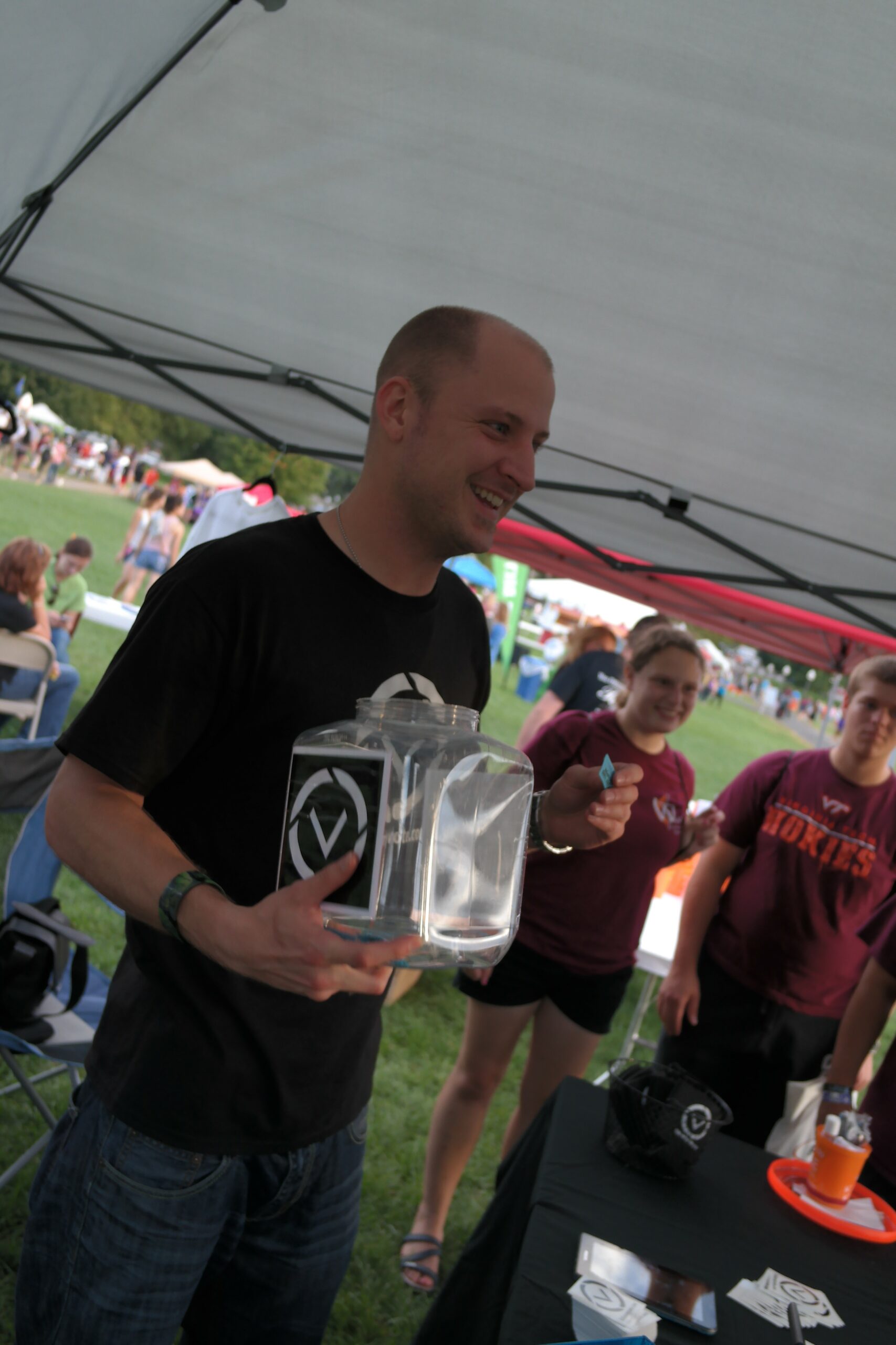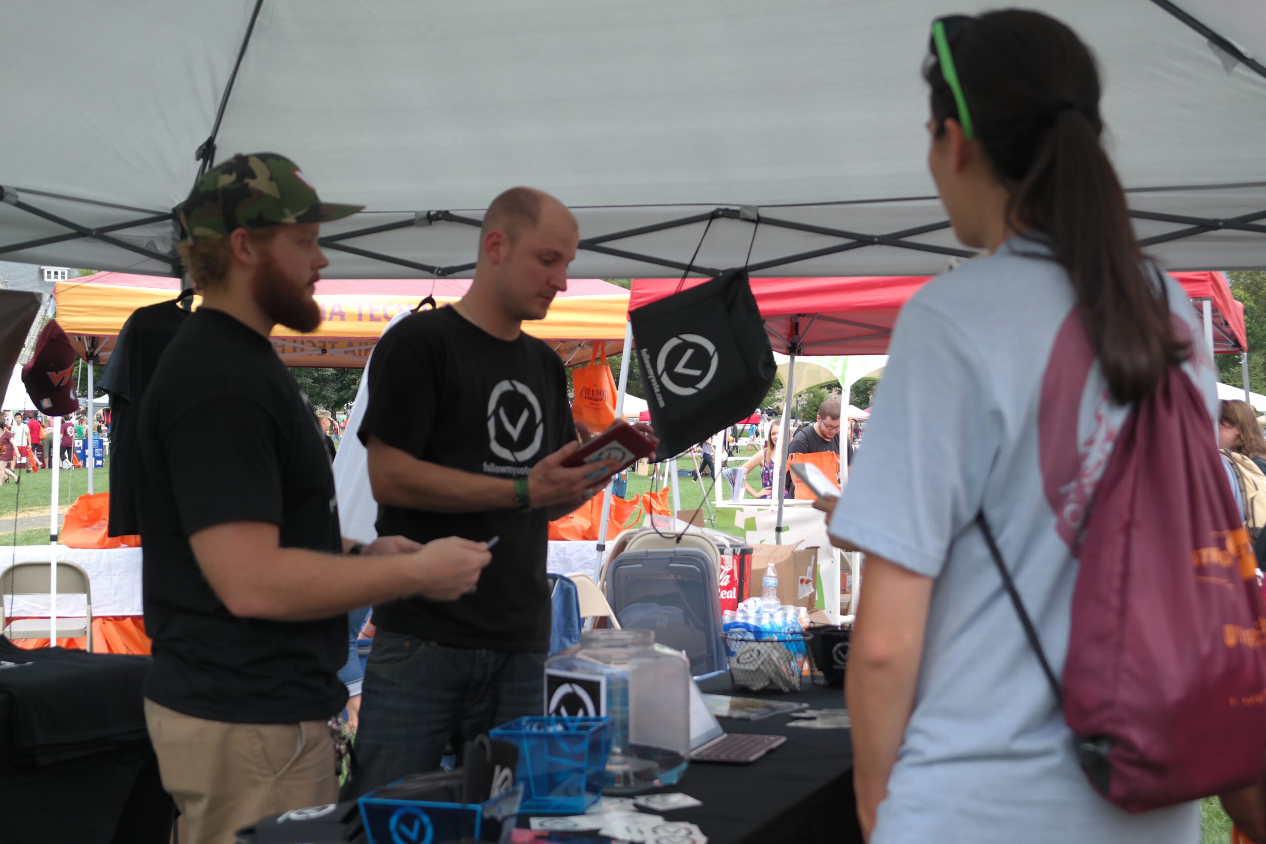 This gave us a chance to explain some of the cool technologies behind the voting software like blockchain technology and cryptography. When informing students of our plans to develop an online voting platform, we gave away Follow My Vote schwag in exchange for signing up to test out the beta version of the app as soon as it’s ready to go. At the end of the event, we even held a raffle where several students won Hokie t-shirts and hats.